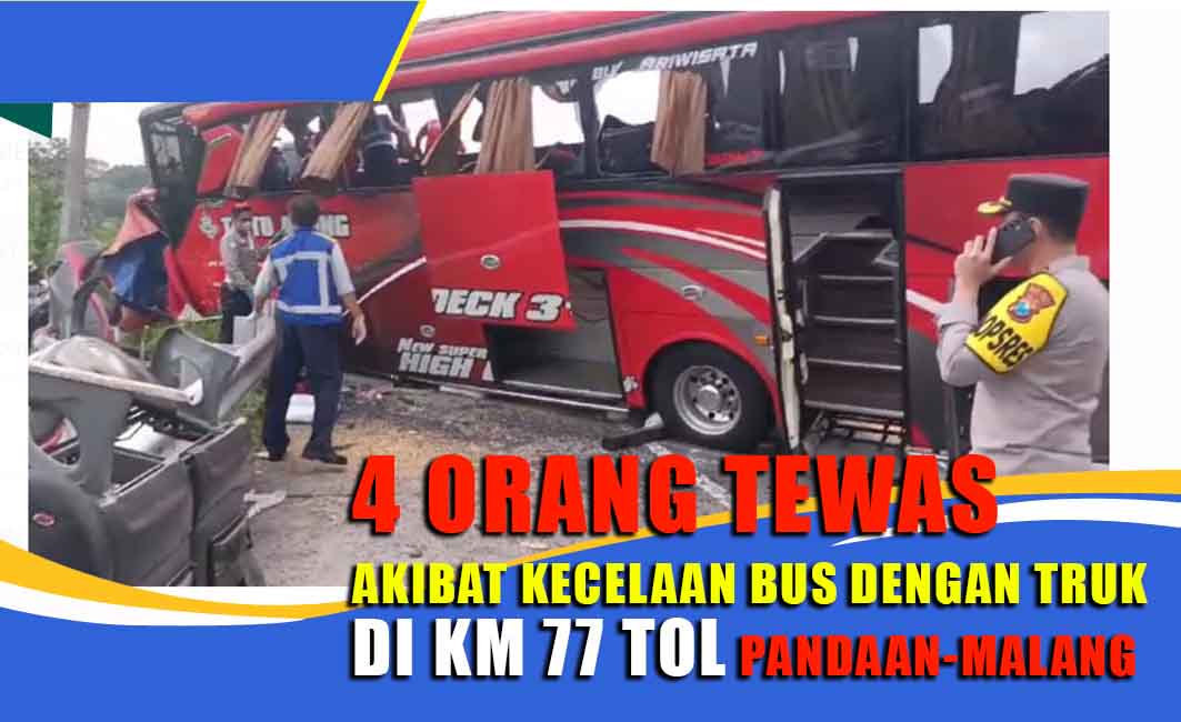MALANG, “tabloidnusantara.com” – Sebuah kecelakaan yang melibatkan Bus dengan Truk terjadi di KM 77+200 tol Pandaan-Malang, Jawa Timur, empat orang dilaporkan meninggal dunia dalam insiden kecelakaan bus rombongan siswa SMP dengan truk bermuatan.