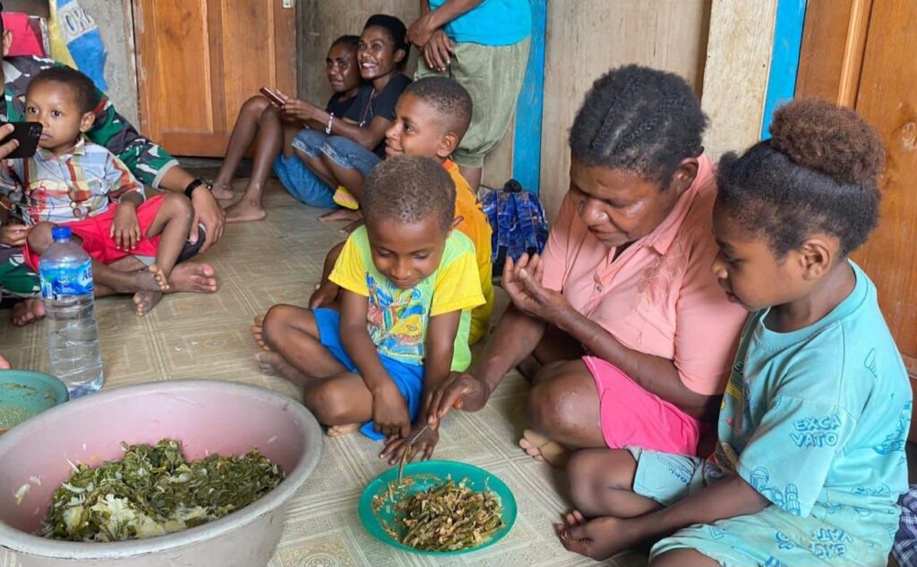 Kegiatan anjangsana Satgas Yonif 143/TWEJ yang dipimpin Danpos Yuruf Lettu Inf Sukamto disambut gembira oleh keluarga Bapak Derex (56) mengenalkan makanan tradisional Pecel sebagai menu makanan yang mudah dibuat dan sarat akan kandungan gizi.