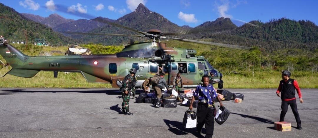 ATASI KEKERINGAN DI PUNCAK JAYA, TNI KERAHKAN DUA HELI EC-725 CARACAL ANGKUT BANSOS
