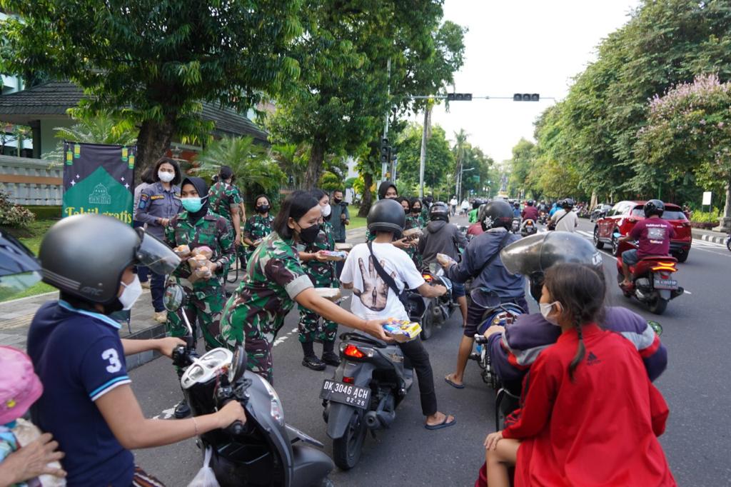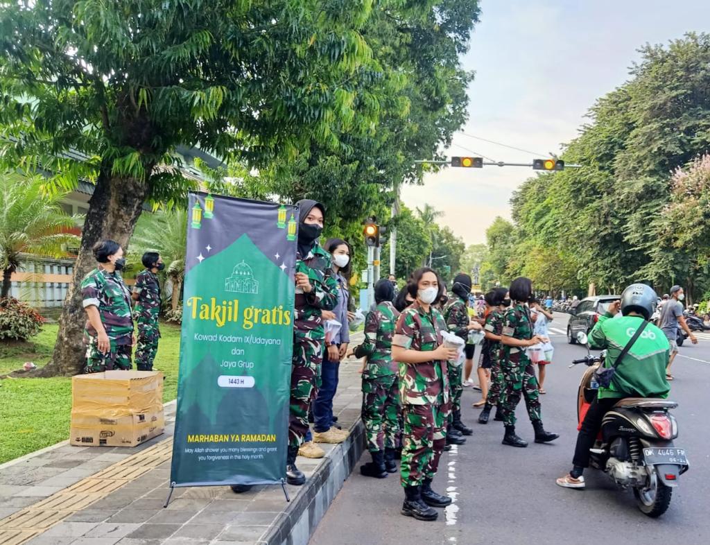 Anggota Korps Wanita Angkatan Darat (Kowad) Kodam IX/Udayana ini tampak membagikan takjil secara gratis di depan Makodam IX/Udayana, Denpasar, pada Selasa (26/4/2022) sore.