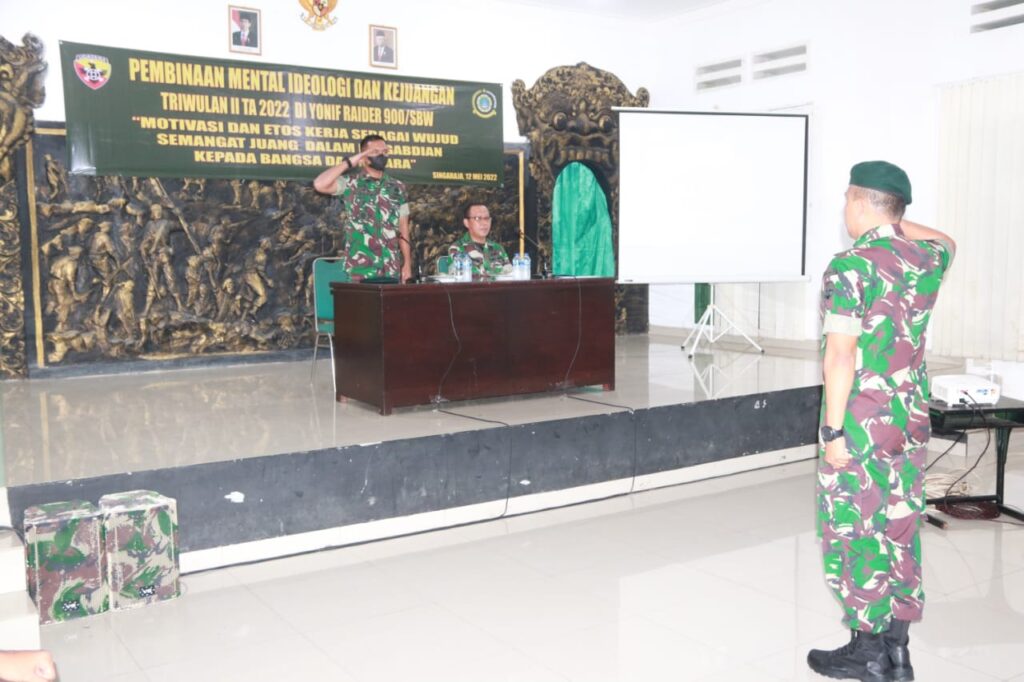 Singaraja, “TABLOIDNUSANTARA” – Yonif Raider 900/SBW menyelenggarakan kegiatan Pembinaan Mental Ideologi dan Kejuangan (Bintalidjuang) TW II TA. 2022, yang dilaksanakan di Aula Mako Yonif Raider 900/SBW, Jalan P.B Sudirman No. 14, Singaraja, pada Kamis (12/5/2022).