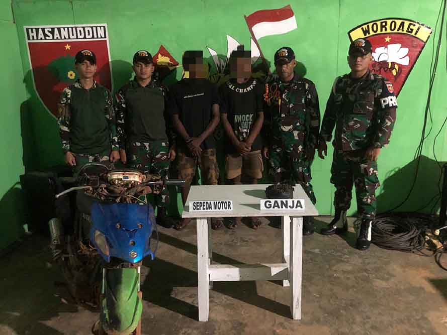 “Kedua pelaku di amankan kedapatan membawa narkotika jenis ganja kering yang dibungkus plastik hitam dan disimpan dalam saringan udara motor dengan berat ±250 gram. Dua pemuda yang ditangkap yakni R (24) dan A (18) yang masih berstatus pelajar SMA.” ujar Letda Inf Ld. Abubakar.