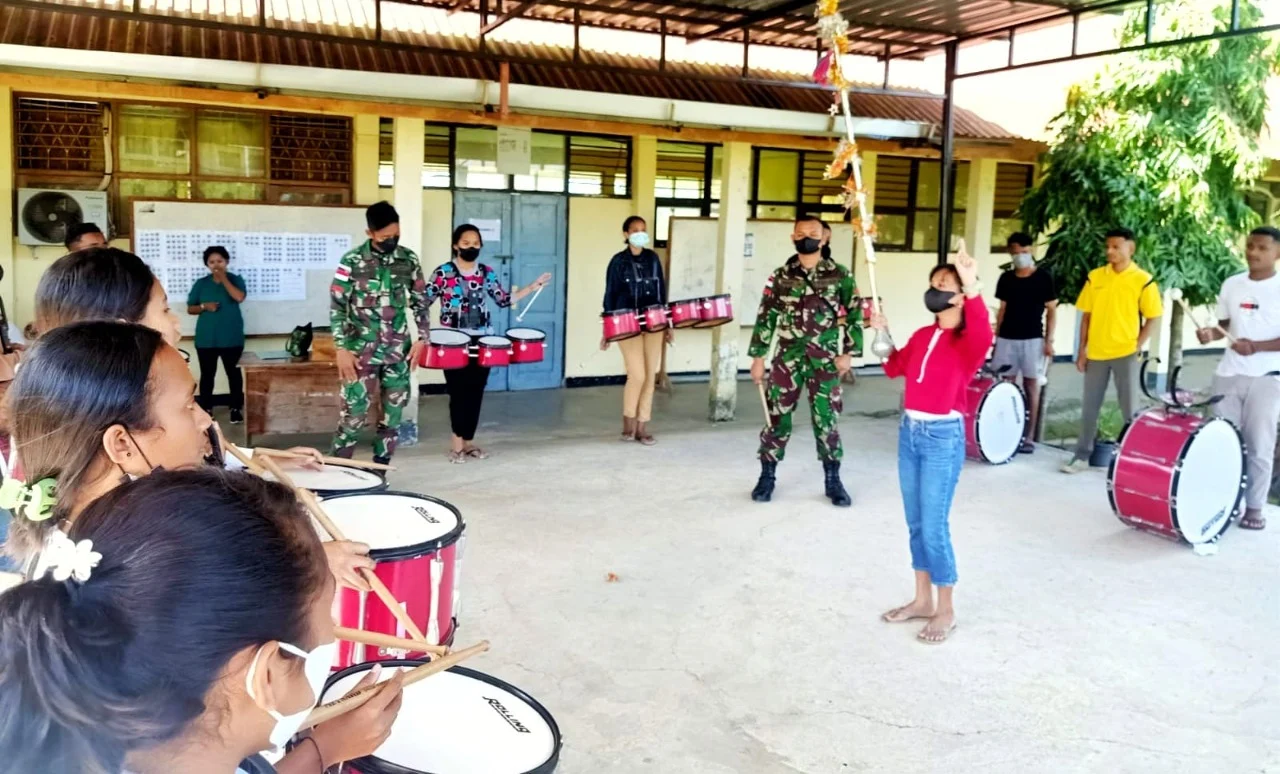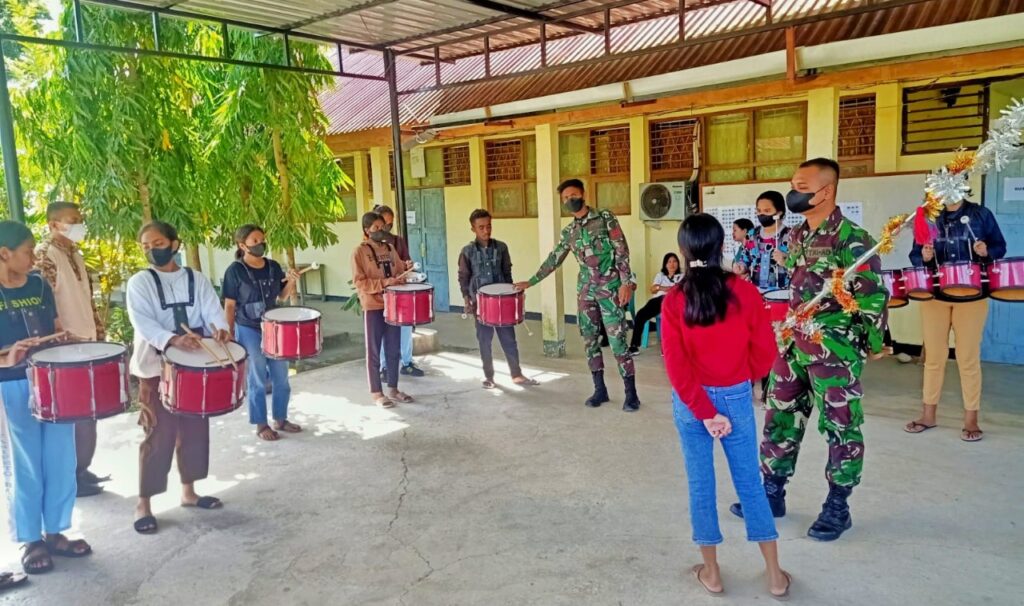 Belu, “TABLOIDNUSANTARA” – Prajurit Satgas Pamtas RI-RDTL Yonif 743/PSY Pos Kotis melatih keterampilan bermain Drumband di SMAN 1 Tasifeto Barat, Desa Bakustulama, Kecamatan Tasifeto Barat, Kabupaten Belu, Provinsi NTT, pada Rabu (11/5/2022).