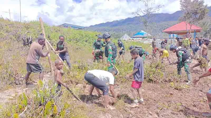 PUNCAK PAPUA, “tabloidnusantara.com” – Dalam rangka meningkatkan kesejahteraan dan kebersamaan masyarakat di wilayah Papua, Satuan Tugas Mobile Raider 300 Siliwangi Pos Eromaga yang dipimpin oleh Letda Inf Didin melakukan kegiatan pembangunan lapangan volly di Desa Eromaga, Distrik Ilaga, Kabupaten Puncak, Papua dengan melibatkan anggota Satgas dan masyarakat setempat.