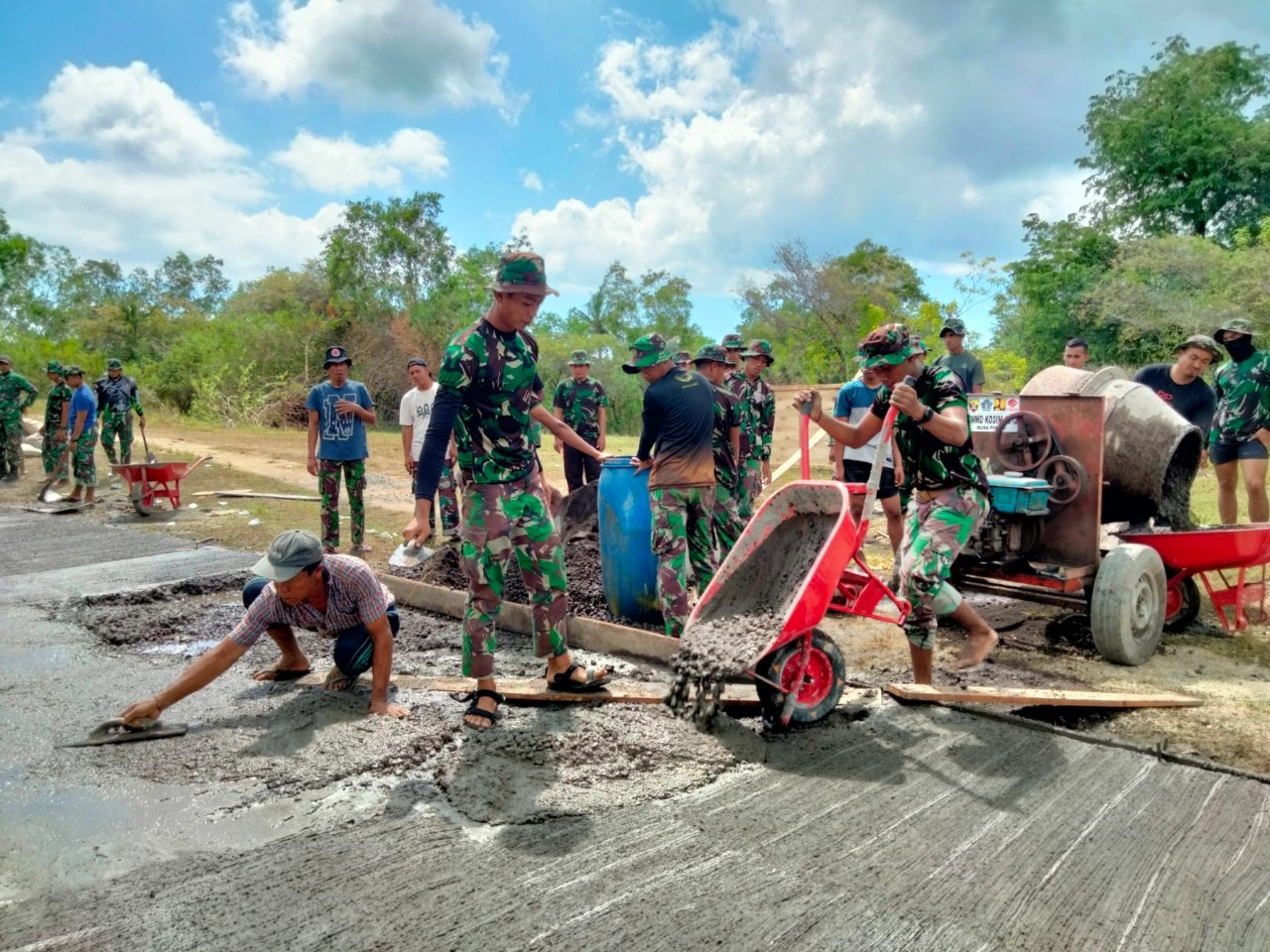 Sesekali diwarnai guyonan dan candaan Satgas TMMD bersama masyarakat terlihat sudah sibuk di depan molen cor dan angkong untuk mengerjakan betonisasi dilokasi tersebut.