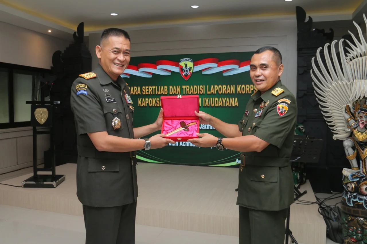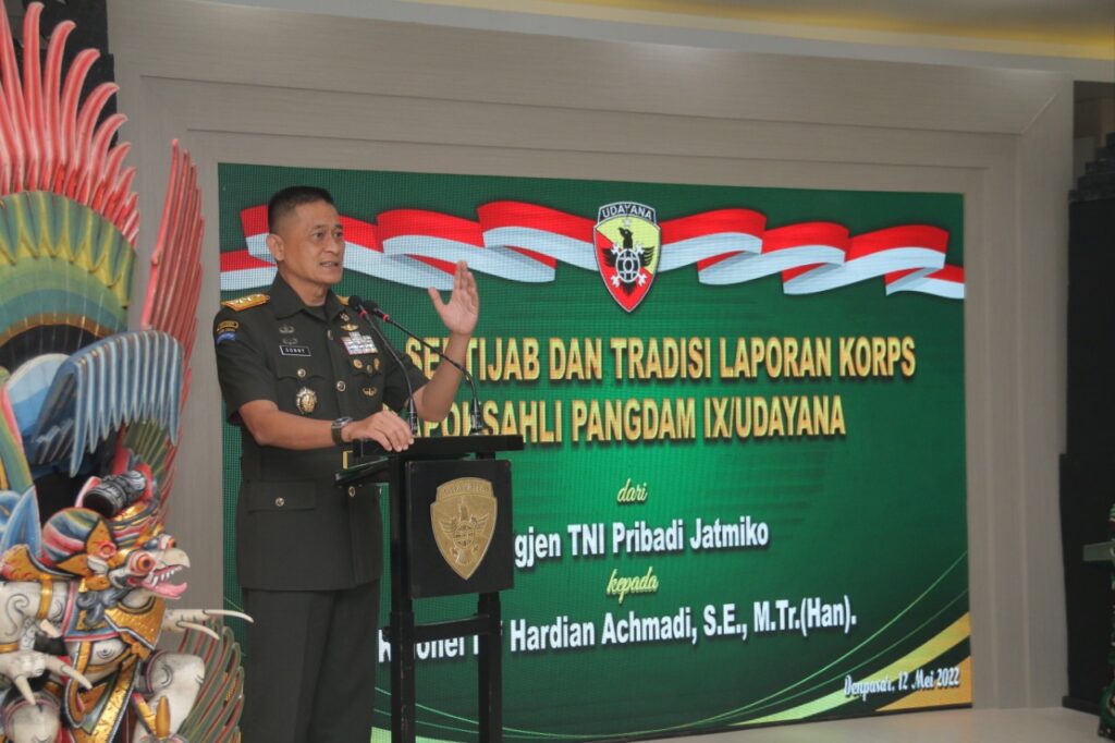Demikian disampaikan Pangdam IX/Udayana Mayjen TNI Sonny Aprianto, S.E., M.M., dalam sambutannya saat kegiatan serah terima jabatan Kepala Kelompok Staf Ahli (Kapok Sahli) Pangdam IX/Udayana dari pejabat lama Brigjen TNI Pribadi Jatmiko kepada penggantinya Kolonel Inf Hardian Achmadi, S.E., M.Tr(Han)., di Hall Makodam IX/Udayana, Denpasar, pada Kamis (12/5/2022).