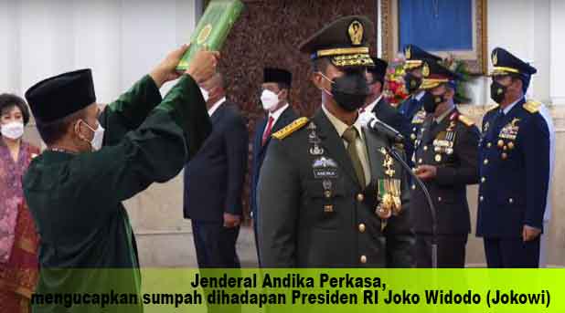 JAKARTA, “Tabloid Nusantara” – Jenderal Andika Perkasa, mengucapkan sumpah dihadapan Presiden RI Joko Widodo (Jokowi) saat melantik Jenderal bintang empat sebagai Panglima TNI, Rabu (17/11/2021), di Istana Negara, Jakarta. Pelantikan Panglima TNI yang baru ini berdasarkan Keputusan Presiden Republik Indonesia…