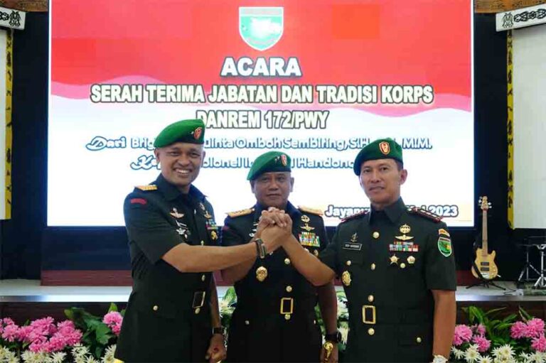 JAYAPURA, “tabloidnusantara.com” ~ Panglima Kodam XVII/Cenderawasih Mayjen TNI Muhammad Saleh Mustafa didampingi Ketua Persit Kartika Chandra Kirana Daerah XVII/Cenderawasih Ny. Eka Muh. Saleh Mustafa memimpin Serah Terima Jabatan dan Tradisi Korps Pejabat Kodam XVII/Cenderawasih di Aula Tony A Rompis Makodam…