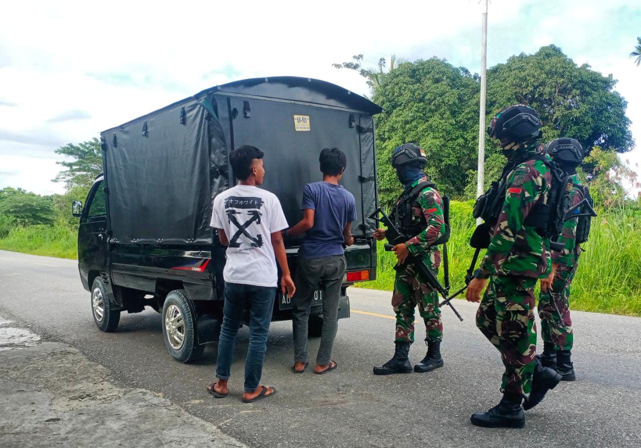 KEEROM, “TABLOIDNUSANTARA.COM” – Personel Satgas Pamtas RI-PNG Yonif 711/Rks melaksanakan pemeriksaan di jalan lintas Desa Arso Kota, Kecamatan Arso, Kabupaten Keerom. Papua, Senin (7/3/2022).