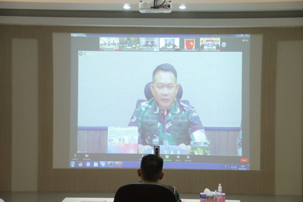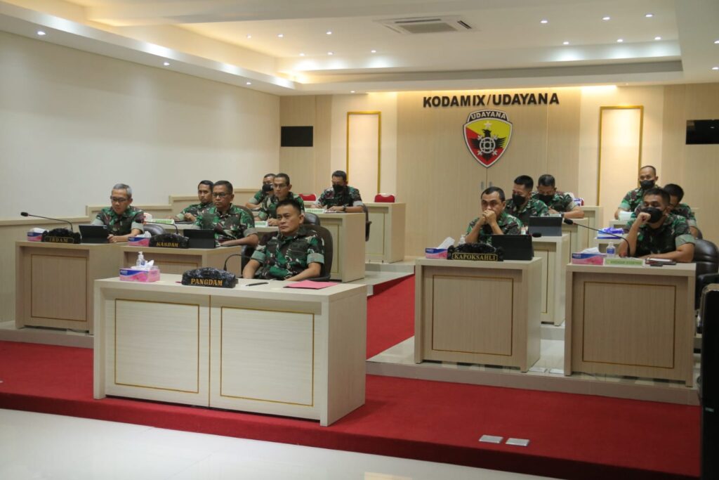 Denpasar, “TABLOIDNUSANTARA” – Bahas kesiapan Kotamaops dalam rangka antisipasi Bangsit Hari Raya Idul Fitri 1443 H Tahun 2022, Pangdam IX/Udayana Mayjen TNI Sonny Aprianto, S.E., M.M., mengikuti video conference (vidcon) yang dipimpin langsung oleh Kepala Staf Angkatan Darat (Kasad) Jenderal TNI Dudung Abdurachman, S.E., M.M., di Ruang Puskodalops Lantai II Makodam IX/Udayana, Denpasar, pada Selasa (26/4/2022).