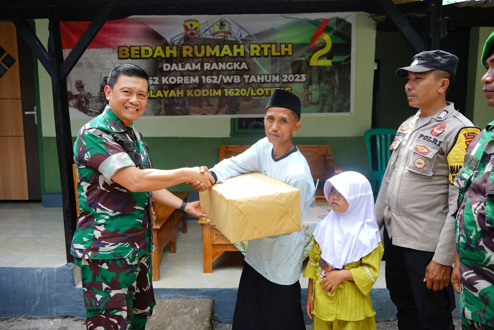 Didampingi Dandim 1620/Loteng Letkol Kav I.F Andi Yusuf Kertanegara, Danrem 162/WB langsung menuju obyek Rumah Tidak Layak Huni milik warga atas nama saudara Marzuki yang sedang dalam pengerjaan renovasi agar menjadi rumah yang lebih layak huni kembali. Selain meninjau pengerjaan renovasi, Danrem juga memberikan bingkisan.