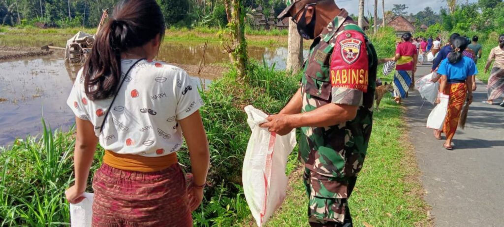 Babinsa selalu bersinergi dengan Babinkamtibmas mengajak masyarakat melaksanakan kegiatan gotong royong untuk tetap menjaga kebersihan lingkungan dari sampah plastik di Banjar Adat Payuk, Desa Peninjaoan, Kecamatan Tembuku, Kabupaten Bangli bersama masyarakat khususnya Ibu PKK dan STT Desa Peninjaon.