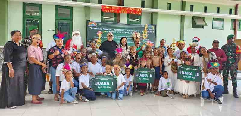 Kegiatan lomba vocal group lagu rohani dibuka untuk tingkat Paud, Anak Sekolah Minggu, SD dan SMP yang diselenggarakan oleh Kodim 1716/Tolikara dalam rangka menyambut Hari Natal 25 Desember 2023 dan Tahun Baru 1 Januari 2024.