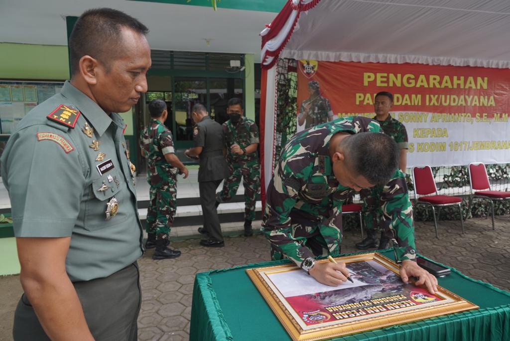 Dalam kunjungan kerjanya di Kodim 1617/Jembrana, Mayjen TNI Sonny Aprianto, S.E., M.M., yang didampingi para Asisten Kasdam IX/Udayana dan Kapendam IX/Udayana tersebut menulis pesan dan kesan “Tetap Semangat Dalam Membantu Kesulitan Rakyat di Wilayah Kodim 1617/Jembrana”. (Pendam IX/Udy)