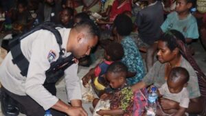 Anggota Polres Nduga, Papua Pegunungan, Sabtu (1/7/2023) memberikan bantuan makanan siap santap ke warga Distrik Kroptak yang mengungsi ke Kenyam. (voi.id)
