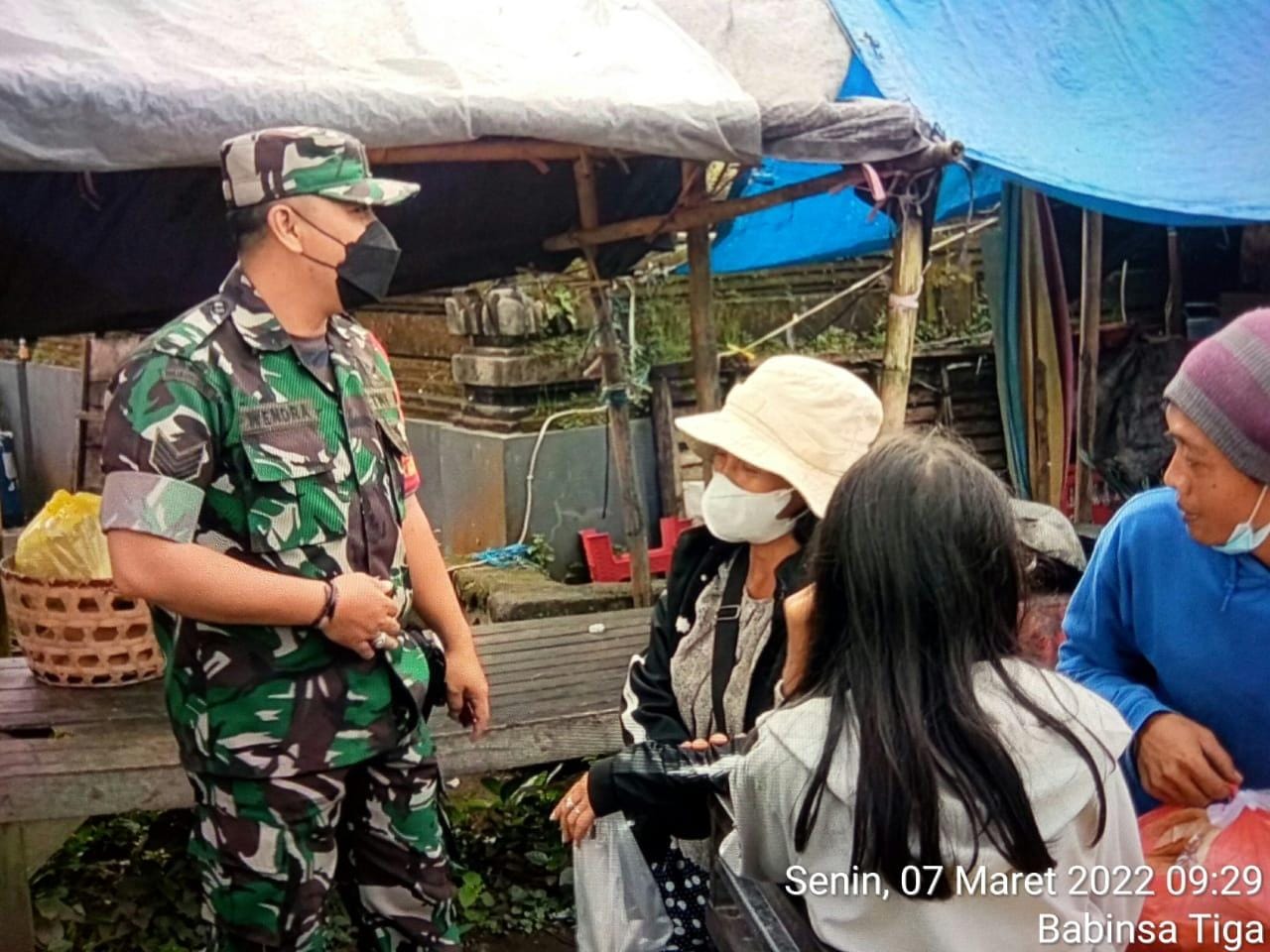Bangli, “TABLOIDNUSANTARA.COM” – Menjalin komunikasi sosial dengan masyarakat dapat dilakukan dimana saja, baik silahturahmi dirumah, di jalan, maupun di warung, seperti halnya yang dilakukan oleh Babinsa Desa Tiga Koramil 1626-02/Susut Serma I Nengah Wendra yang melaksanakan komsos di Pasar Tradisional, pada Senin (7/3/2022).