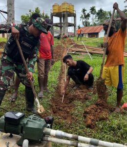 PAPUA, “tabloidnusantara.com” – Satgas Pamtas Yonif 111/KB dan Tim Relawan Rumah Zakat dalam Program Binter Kolaborasi dengan Aksi Donasi Rumah Zakat sudah mulai memperbaiki Saluran Air Bersih Umum masyarakat kampung Pedalaman Distrik Kombut Kab.Boven Digoel Papua Selatan, Kamis (5/10/2023)