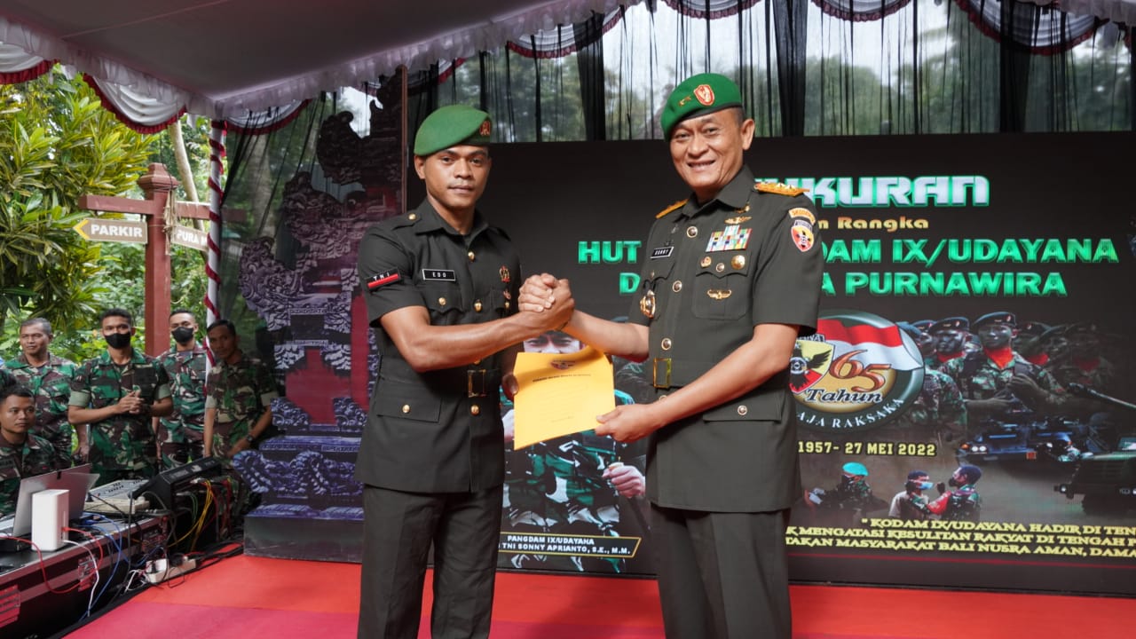 Acara dilanjutkan dengan pemotongan tumpeng oleh Pangdam IX/Udayana beserta ibu didampingi Kasdam IX/Udayana beserta ibu, yang selanjutnya diserahkan kepada Prajurit berprestasi Kodam IX/Udayana yang diwakilkan oleh Prada Antonius Manto Obisuru dari Kesatuan Hubdam IX/Udayana. Kemudian, penyerahan Piagam Penghargaan kepada Purnawira Kodam IX/Udayana dan Prajurit berprestasi Kodam IX/Udayana.