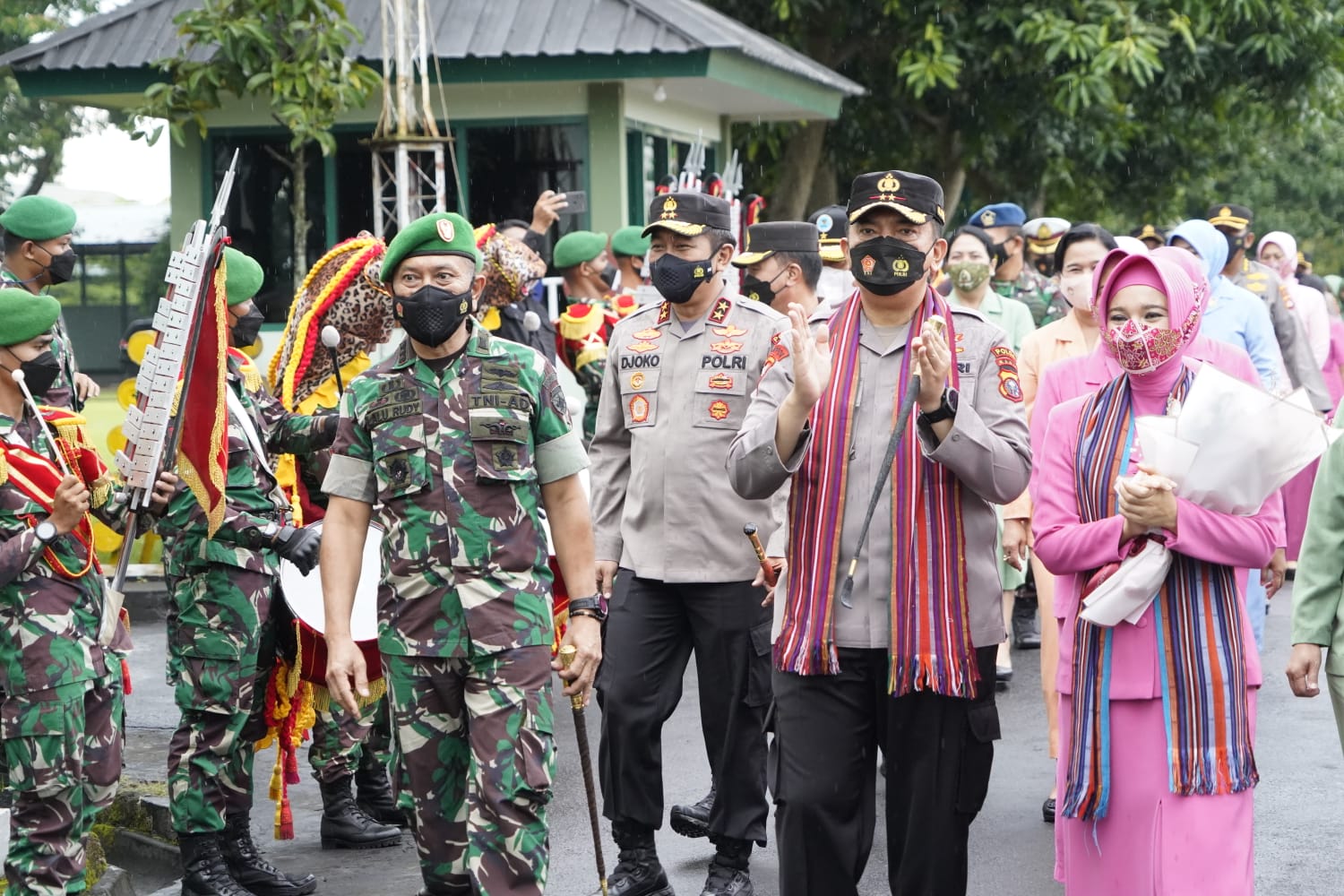 Tradisi Penerimaan ditandai dengan pengalungan selendang kepada Irjen Pol Djoko Poerwanto dan pemberian bunga tangan kepada Ibu Irna Djoko Poerwanto setelah terlebih dahulu menerima laporan dan jajar kehormatan dari regu jaga saat memasuki Makorem.