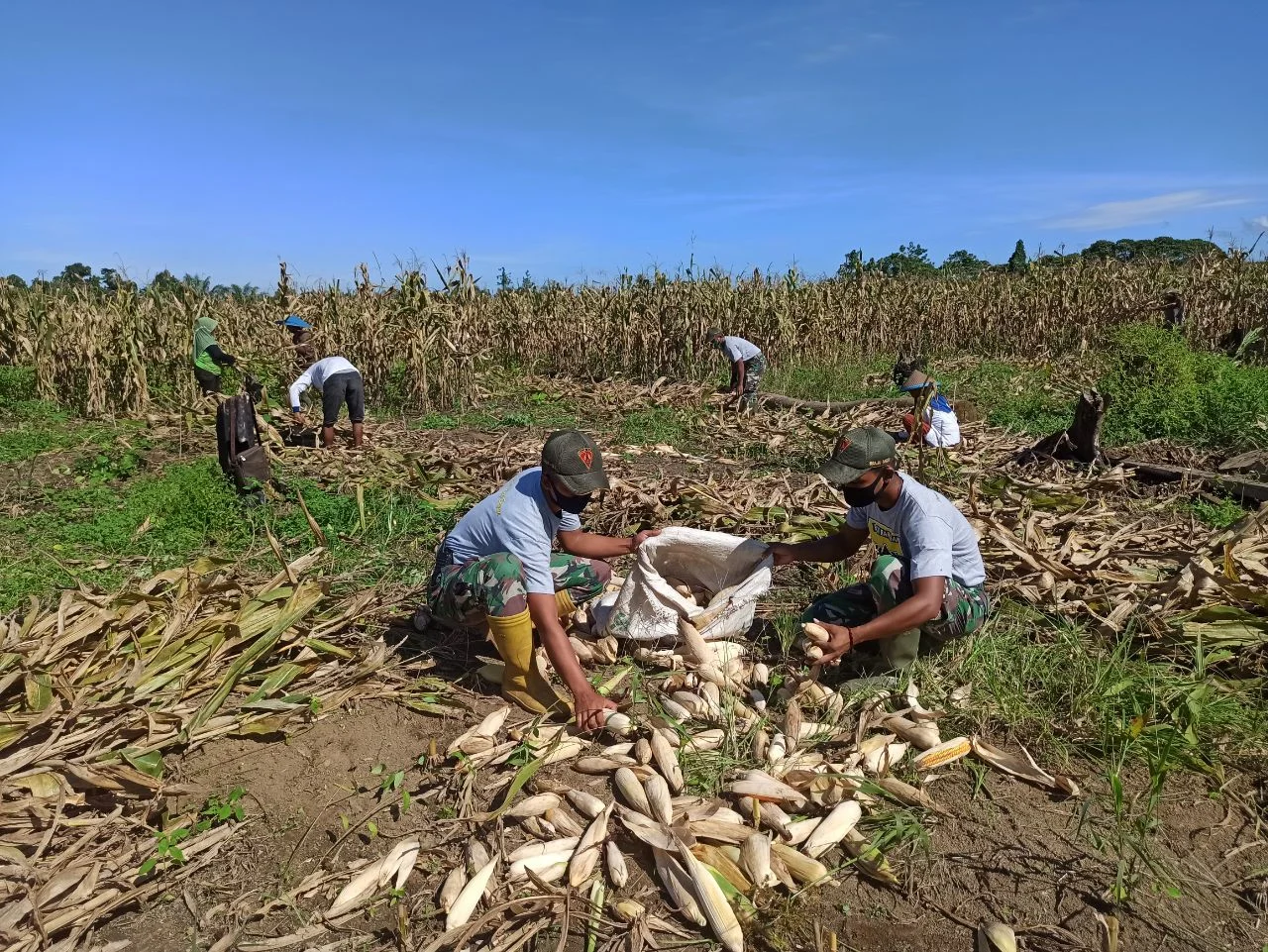 Prajurit TNI Satgas Pamtas Yonif 131/Brs Pos Yetti bersama masyarakat melaksanakan panen jagung, bertempat di Kampung Yetti Distrik Arso Timur Kab. Keerom, Papua. Rabu (10/11/2021).