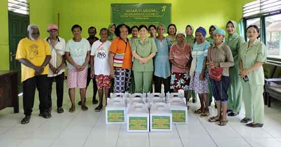 Ny. Titien Agustinus Ressa Sala’pa selaku Ketua Persit KCK Cabang XXXVII Kodim 1711/BVD dan pengurus menyerahkan donasi bakti sosial berupa sembako dan beberapa kebutuhan harian.