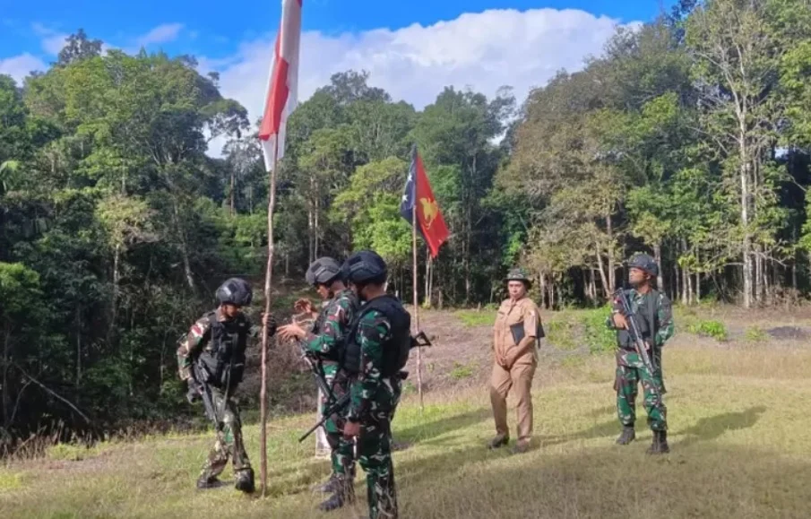 Satgas Pamtas Statis RI- PNG Yonif RK 111/KB sektor Boven Digoel Papua Selatan pertama kalinya menancapkan bendera merah putih dipatok MM 8.1 Perbatasan RI- PNG bersama unsur pemerintah dan Satkowil dari Kodim 1711 Boven Digoel usai serah terima tugas dengan Yonif 725/WRG, Rabu 09/08/2023.