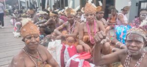 Puluhan ribu warga Asmat dengan pakaian adat daerahnya, setia menunggu Presiden Jokowi di luar kawasan Bandara Ewer. Mereka tampak senang melihat Presiden Jokowi berjalan keluar sambil bersapa tegur seusai meresmikan Bandara Ewer.