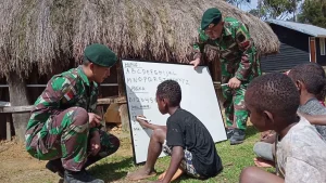 LANNY JAYA, tabloidnusantara.com – Dalam mengiringi tugasnya di Pegunungan tengah Kabupaten Lanny Jaya Papua, Prajurit Satgas Yonif MR 412 Kostrad berbagi suka cita keceriaan bersama anak-anak di daerah penugasan, ini dilakukan sebagai upaya mendukung pola pembinaan teritorial karena keceriaan anak-anak merupakan representasi kedamaian dan ketentraman suatu daerah.