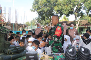 Kepolosan, senyum dan tawa ceria tak luput menghiasi wajah anak-anak TK Nurul Huda saat diperkenalkan berbagai perlengkapan TNI.
