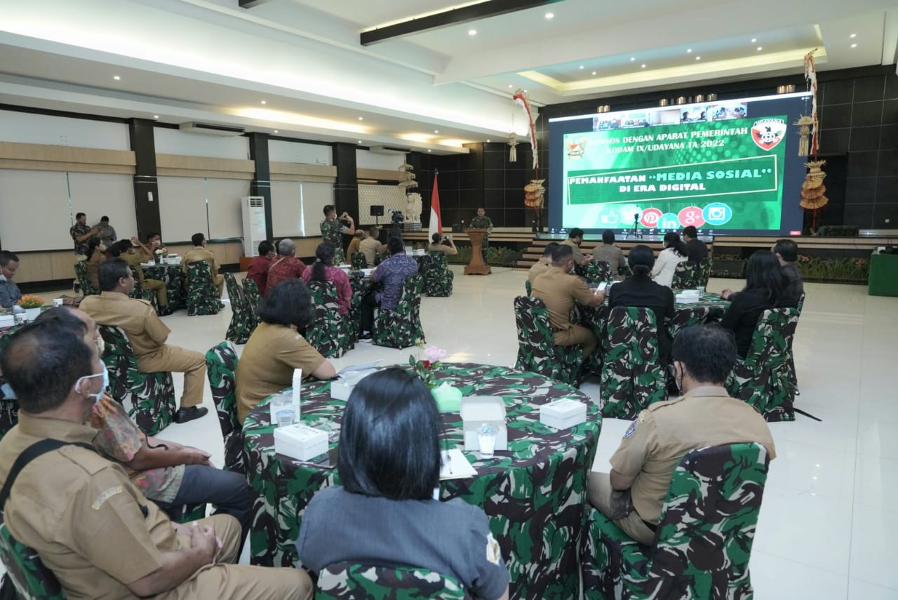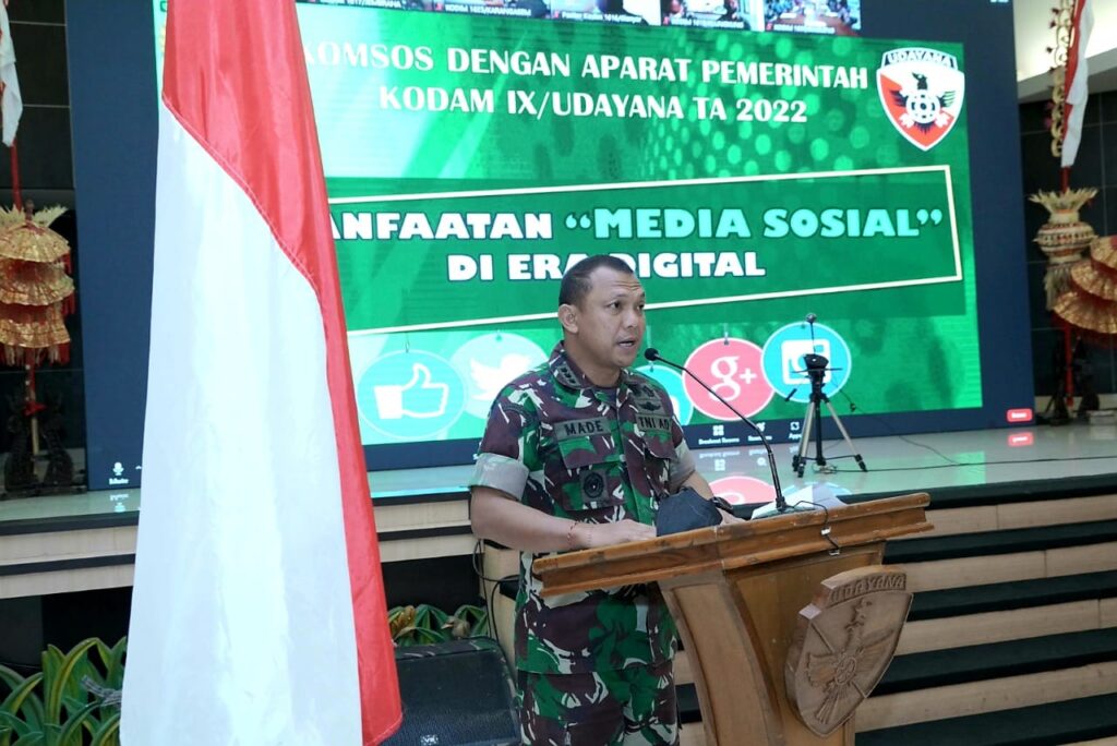Demikian disampaikan Aster Kasdam IX/Udayana Kolonel Inf I Made Mahaparta, S.I.P., membuka kegiatan Komunikasi Sosial (Komsos) dengan Aparat Pemerintah bersama Kodam IX/Udayana TA 2022 dengan tema “Pemanfaatan Media Sosial di Era Digital”, bertempat di Aula Udayana Makodam IX/Udayana, Denpasar, pada Senin (28/3/2022).