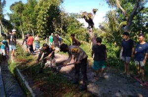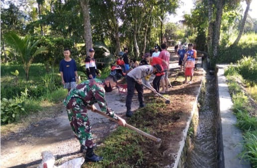 KOMPAK GOTONG ROYONG, BABINSA KORAMIL SIKUR BERSAMA WARGA BERSIHKAN BADAN JALAN