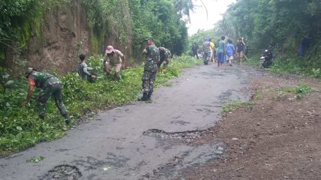 Lombok Timur, “TABLOIDNUSANTARA.COM” – Puluhan anggota Koramil 1615-11/Aikmel bersama masyarakat melaksanakan gotong royong pembersihan saluran air dan tanaman liar yang tumbuh menutupi badan jalan di Dusun Al Abror Desa Kalijaga Selatan Kecamatan Lenek Kabupaten Lombok Timur, Jumat (20/1/2022).