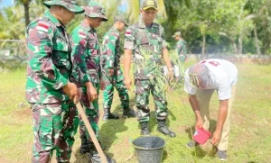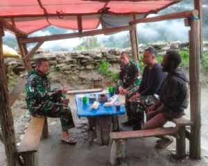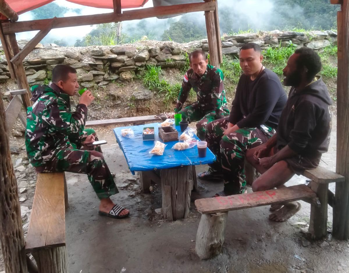 Usai memberikan arahan kepada personelnya, Dansatgas menyempatkan diri untuk melaksanakan komunikasi sosial (Komsos) dengan Bapak Yokiles Enumbi (50) yang merupakan tuan tanah di kampung Tinolok.