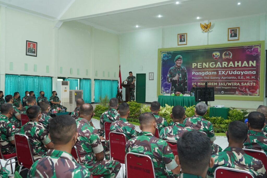 Kupang, “TABLOIDNUSANTARA.COM” – Dalam kunjungan kerja (Kunker) perdananya di wilayah Nusa Tenggara Timur (NTT), Pangdam IX/Udayana Mayjen TNI Sonny Aprianto, S.E., M.M., memberikan pengarahan kepada Prajurit dan PNS Jajaran Korem 161/Wira Sakti yang dilaksanakan di Aula Sudirman Korem 161/Wira Sakti, Jl. W.J. Lalamentik, Kecamatan Oebobo, Kota Kupang, pada Senin (7/2/2022).