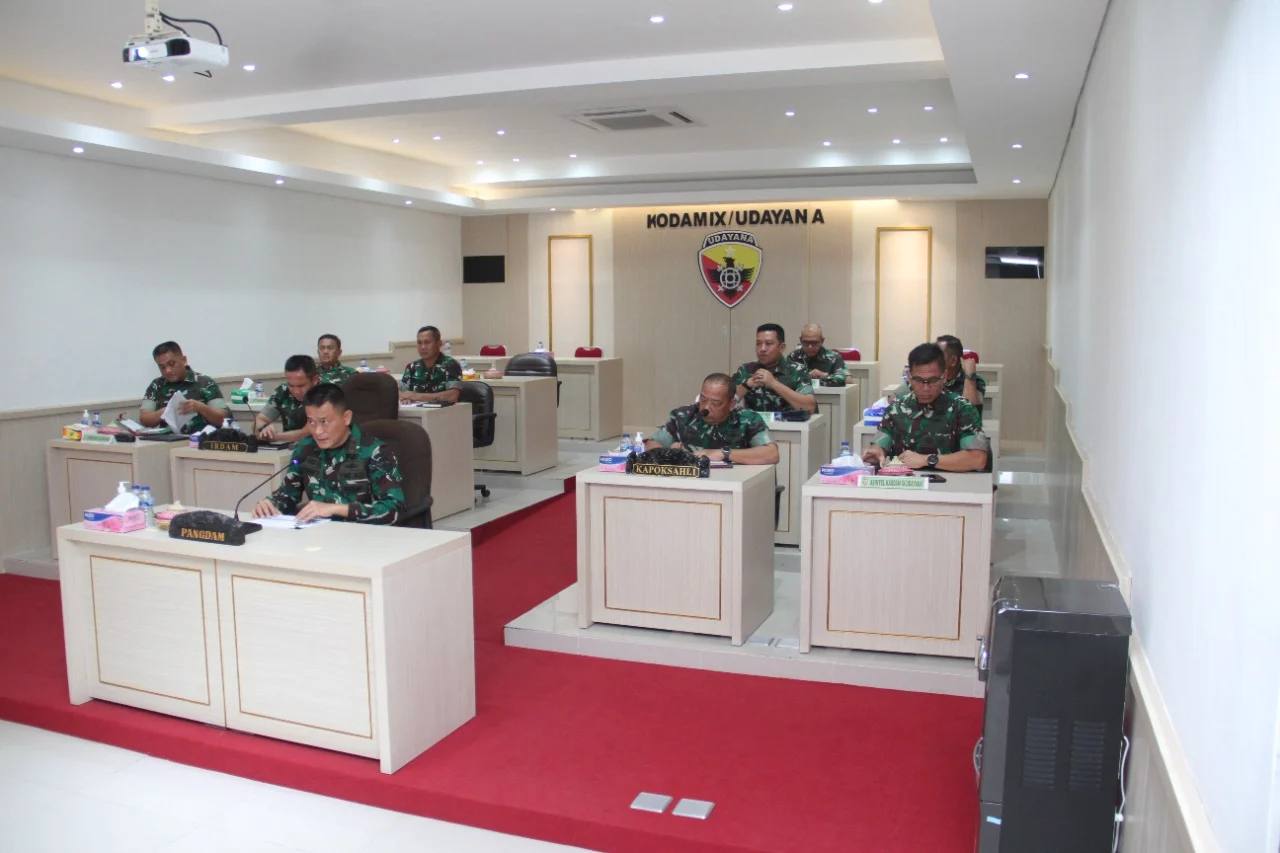 Denpasar – Panglima Komando Daerah Militer (Pangdam) IX/Udayana Mayjen TNI Sonny Aprianto, S.E., M.M., menggelar Jam Pimpinan melalui video conference (Vidcon) kepada seluruh Dan/Ka Satuan Jajaran Kodam IX/Udayana, bertempat di Ruang Yudha Puskodalopsdam IX/Udayana, Jalan Udayana No. 1, Kota Denpasar, Provinsi Bali, Selasa (20/12/2022).