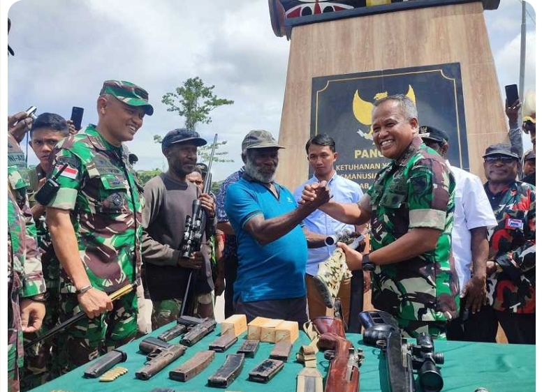 KEEROM, “Tabloidnusantara.com” – Usai meresmikan Tugu Pancasila, Pangdam XVII/Cenderawasih Mayjen TNI Muhammad Saleh Mustafa, menerima secara simbolis penyerahan enam pucuk Senjata Api beserta munisinya hasil penggalangan dari mantan Kelompok Separatir Teroris, wilayah Kabupaten Keerom, Lambert Pakikir dan Lezarus Karoba. “Senin, (01/05/2033).