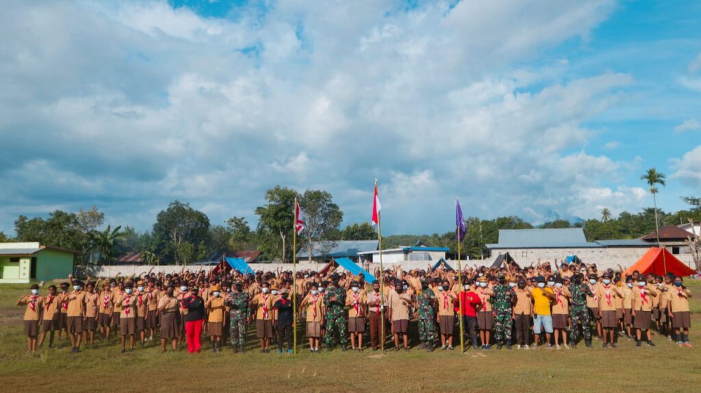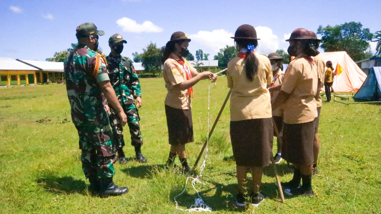 Belu – Prajurit Kotis Satgas Pamtas RI-RDTL Yonif 743/PSY bentuk karakter generasi muda melalui kegiatan Perkemahan Gerakan Pramuka di Gugus Depan 057/058 SMKS Katolik Kusuma Atambua yang berada di Jalan Ave Maria, Kecamatan Atambua Barat, Kabupaten Belu, pada Kamis (14/04/2022).