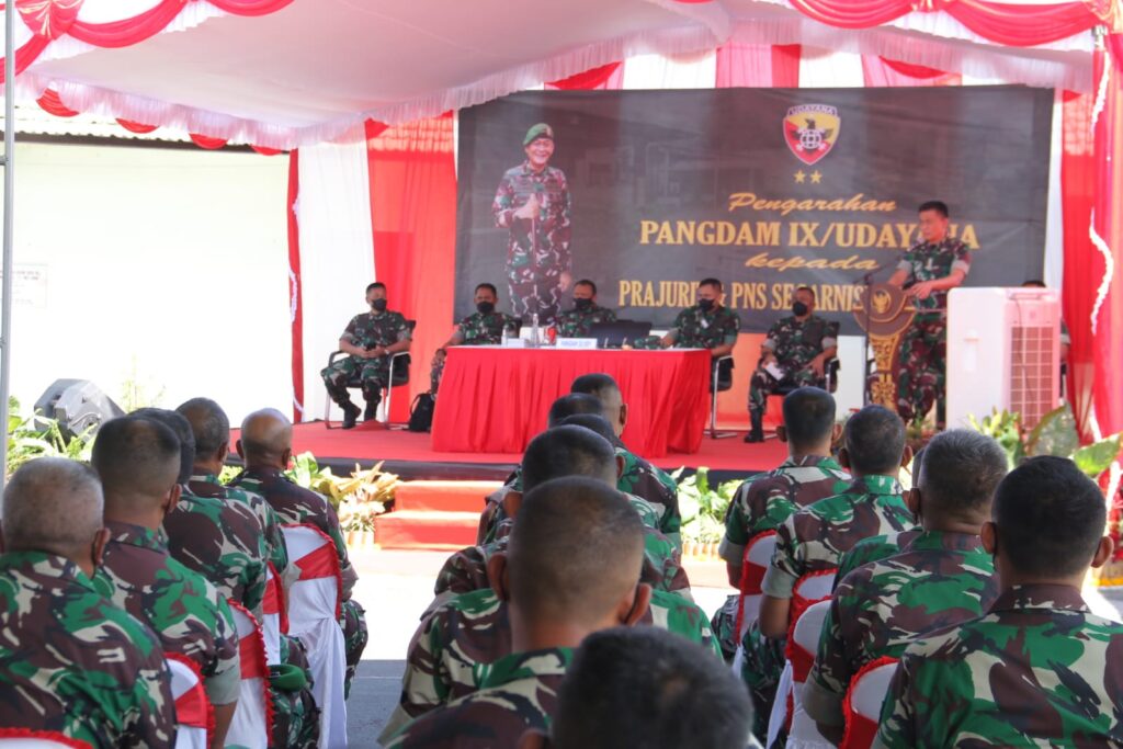 Demikian ditegaskan Pangdam IX/Udayana Mayjen TNI Sonny Aprianto, S.E., M.M., saat memberikan pengarahan kepada Prajurit dan PNS Satuan Jajaran di Makodim 1609/Buleleng, Jalan Gajah Mada No. 142, Kecamatan Buleleng, Kabupateng Buleleng, pada Kamis (24/2/2022).