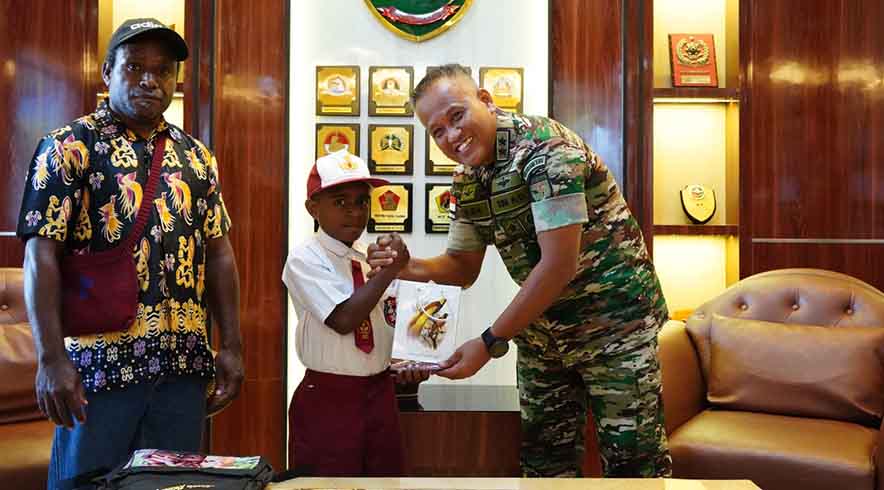 “Raul Fernando Yikwa berusia 9 tahun yang merupakan Siswa Kelas 3 SD Yayasan Terang Kasih Bangsa, Jln.Sagudua Tiofun, Koya Koso, yang mempunyai mimpi memberi penghormatan kepada Presiden RI telah terwujud. “Tegas Kapendam.