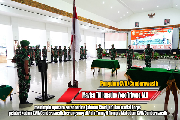 Sertijab pejabat Kodam XVII/Cenderawasih yang dilaksanakan tersebut, yaitu Kasdam XVII/Cenderawasih dari Brigjen TNI Bambang Trisnohadi kepada Brigjen TNI R. Sidharta Wisnu Graha, S.E, dan Irdam Pangdam XVII/Cenderawasih dari Brigjen TNI Wachid Apriliyanto kepada Brigjen TNI Agus Supriyo Winarno.