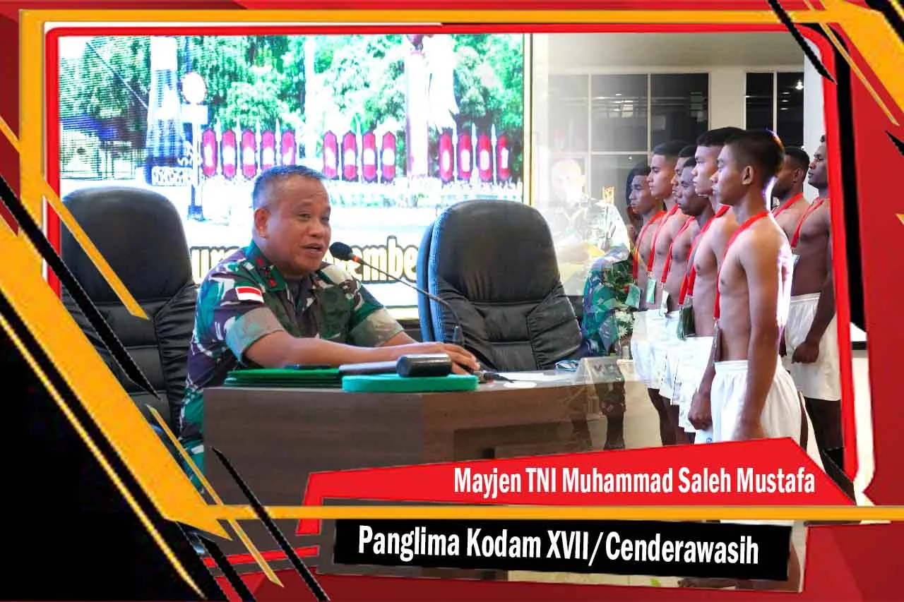Jayapura, “tabloidnusantara.com” – Panglima Kodam XVII/Cenderawasih Mayjen TNI Muhammad Saleh Mustafa secara langsung memimpin Sidang Pantukhir Pusat (Panpus) Tamtama PK TNI AD Reguler dan Khusus Santri Serta Lintas Agama Gelombang II Kodam XVII/Cenderawasih TA 2022 di Aula Tonny A Rompis, Makodam XVII/Cenderawasih, Jayapura, Sabtu (19/11/2022).