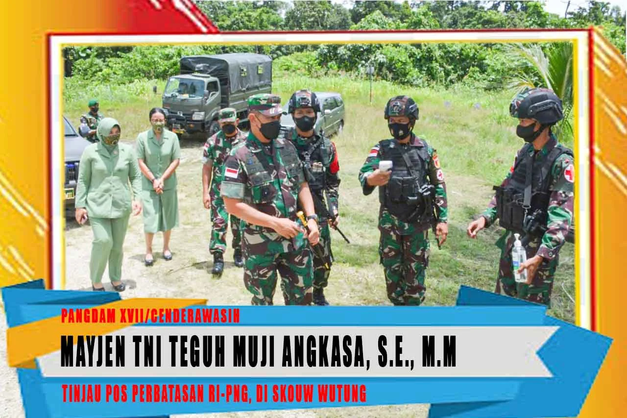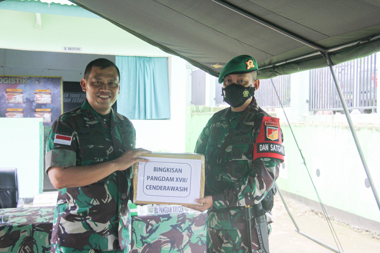 Dalam rangkaian kegiatan kunjungan tersebut Pangdam XVII/Cenderawasih Mayjen TNI Teguh Muji Angkasa, S.E., M.M menyerahan bingkisan kepada Prajurit TNI yang merupakan bentuk kepedulian terhadap prajurit yang sedang melaksanakan tugas di wilayah perbatasan RI – PNG.