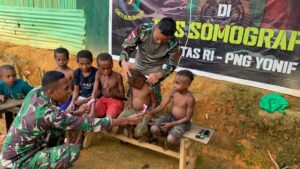 PAPUA, “tabloidnusantara.com” – Peduli akan kerapian dan penampilan anak di perbatasan, Pos Somografi Satgas Yonif 310/KK mencukur rambut anak-anak di Kampung Somografi Distrik Web Kabupaten Keerom, Papua, Senin (18/9/2023).