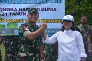 MERAUKE, “tabloidnusantara.com” – Peringati Hari Air Sedunia, Kepala Balai Wilayah Sungai (BWS) Papua Ibu Magdalena Tanga menyerahkan Ratusan set biofori serta ratusan bibit tanaman buah kepada Korem 174/ATW.