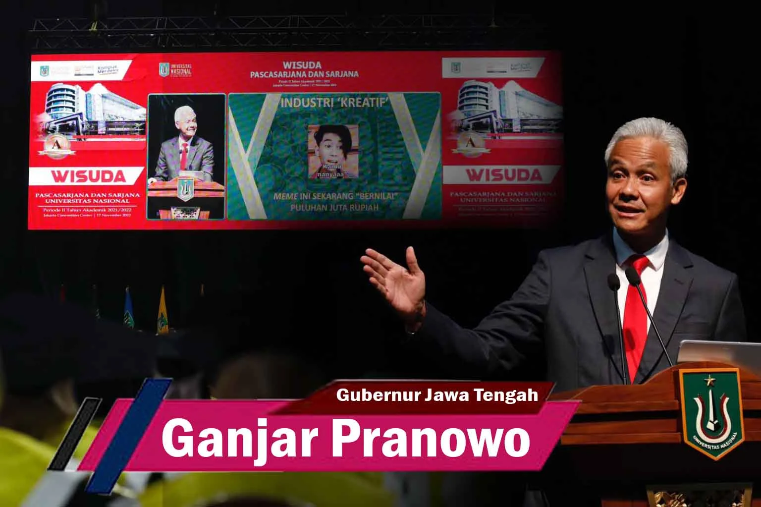 “Ada banyak hal, karena tiap wisuda pasti yang ditanyakan berikutnya mau kerja apa, di mana, dan kapan. Maka, seluruh ilmu yang didapat dari kampus, di Unas harus dipraktikkan,” ujar Ganjar.