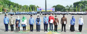 Wakil Bupati Hj. Aminatun Habibah memiimpin upacara peringatan HUT Korpri ke - 50, HUT PGRI ke - 76 Hari Guru Nasional dan Hari Kesehatan Nasional di lingkungan pemerintah Kab. Gresik, Senin (29/11/2021).
