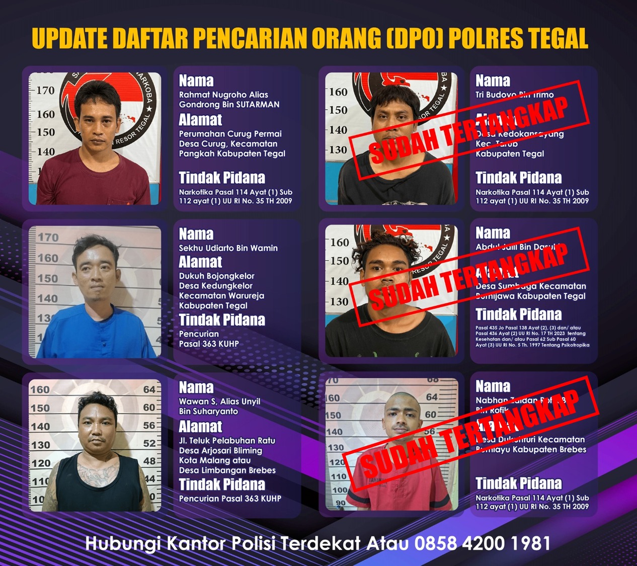 JAKARTA, “tabloidnusantara.com” – Kepolisian dari Polres Tegal berhasil menangkap kembali 3 orang tahanan yang kabur dari sel tahanan dari 6 orang yang melarikan diri. Mereka yang ditangkap adalah Tri Budoyo bin Trimo, Abdul Jalil bin Dasuki, Nabhan Zaidan Rofiq BZ bin Rofiq. Ketiga tahanan yang ditangkap merupakan tahanan dalam kasus narkoba. Sementara tiga lainnya masih dalam pengejaran yaitu Rahmat Nugroho alias Gondrong (kasus narkoba), serta Sekhu Udin dan Wawan yang terlibat dalam kasus pencurian dengan pemberatan.