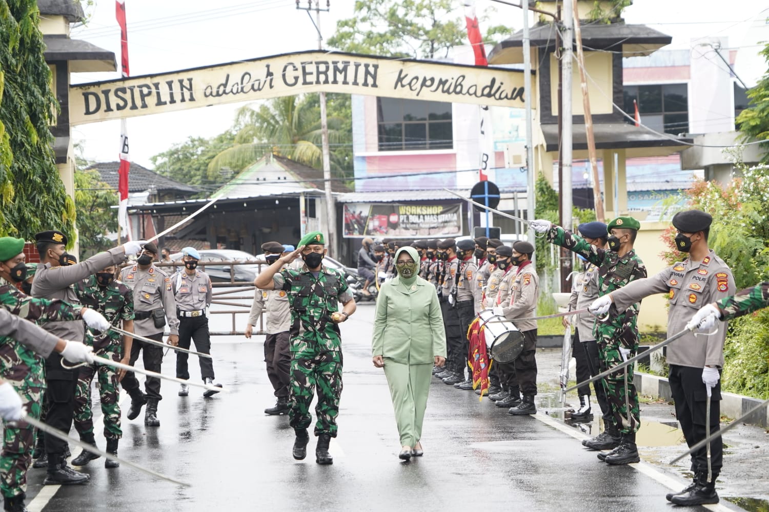 Kedatangan Brigjen TNI Lalu Rudy Irham Serigede, S.T., M. Sc., bersama Ketua Koorcabrem Korem 162/WB di Mapolda NTB disambut dengan Tradisi Pedang Pora TNI-Polri dan pengalungan bunga oleh Gubernur NTB, DR. H. Zulkifliemansyah, S.E., M.Sc.,