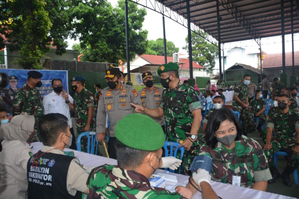 Kemudian usai melaksanakan syukuran Danrem 162/WB, Kapolda NTB beserta Forkopimda yang hadir melanjutkan kegiatan dengan meninjau pemberian Vaksinasi ke 3 jenis Vaksin Booster kepada para prajurit TNI-Polri Se Kota Mataram.