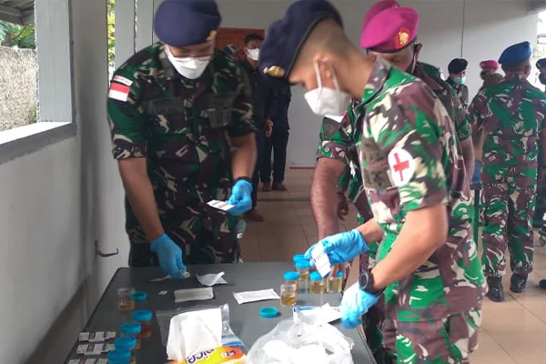 Pemeriksaan urin, usai apel pagi ini di Pimpin langsung Pabanren Sintel Lantamal X, Letkol Laut (P) Apriles Lusien Sukirno, M. Han., M.Tr Opsla dan didampingi Kadiskes Lantamal X, Letkol Laut (K) Agus Pudianto. S. Pros.